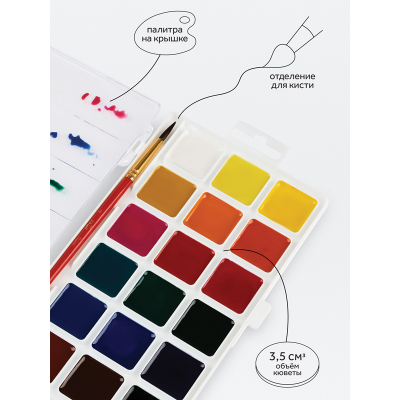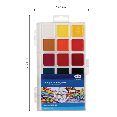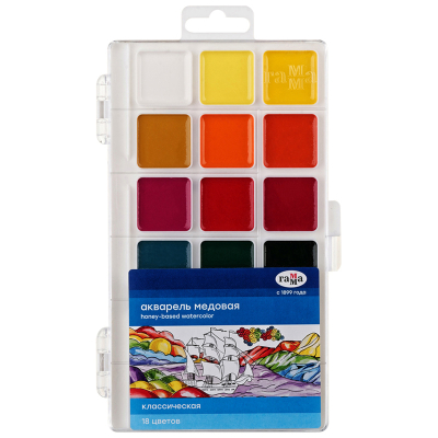 Медовая полусухая акварель ГАММА серии «Классическая» разработана для творческих занятий в школе и дома. Естественные цвета акварели обучают правильному цветовосприятию окружающего мира. Краски изготовлены на основе органических пигментов и натурального связующего. Прозрачность красок, яркость и чистота цвета, разносимость и размываемость — основные характеристики акварели серии «Классическая». Удобный пластиковый пенал: палитра для смешивания красок расположена на крышке, а кюветы с высокими бортиками и увеличенное расстояние между красками не позволяют цветам смешиваться в подложке во время рисования. Акварель легко смывается с рук и отстирывается с одежды.