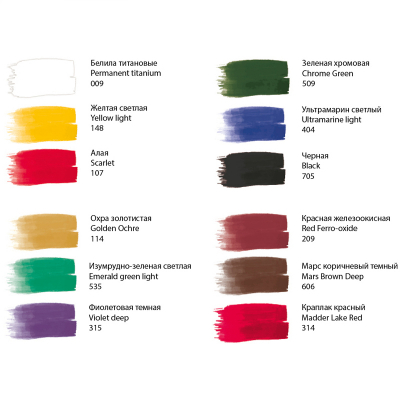 Художественные гуашевые краски ГАММА серии «Модерн» созданы для работы в различных техниках живописи: отличаются высокой кроющей способностью, ложатся на бумагу плотным матовым слоем, а после высыхания дают бархатистый эффект. Гуашь подходит для профессиональных художников и учащихся художественных училищ. В состав входят высококачественные пигменты, поэтому цвета остаются яркими и насыщенными. Набор составлен из 12 цветов: чёрный, белый, коричневый, алый, малиновый, бордовый, охра, жёлтый, зелёный, синий, бирюзовый, фиолетовый. Объём каждой баночки с завинчивающейся крышкой — 20 мл, общий объём — 240 мл.