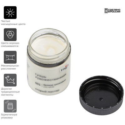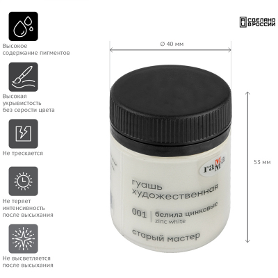 Гуашь художественная «Старый Мастер» - это профессиональные тонкотертые водорастворимые краски. Гуашь имеет уникальную рецептуру, разработанную в собственной исследовательской лаборатории завода совместно с художниками. Краска легко наносится на поверхность, благодаря специальным добавкам сохраняет яркость цвета после высыхания, создает плотный бархатный слой. Краска изготовлена из традиционных художественных пигментов, в том числе пигментов кадмиево-кобальтовой группы. Большая часть цветов имеет самый высокий показатель светостойкости – 100 лет музейного хранения.