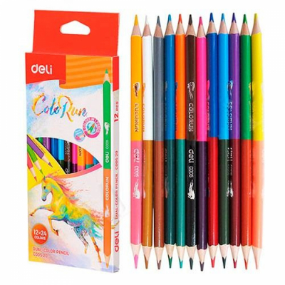 Карандаши двусторонние Deli «ColoRun», 24 цвета, 12 штук, в эргономичном трехгранном корпусе. Яркие, насыщенные цвета, мягкое раскрашивание.