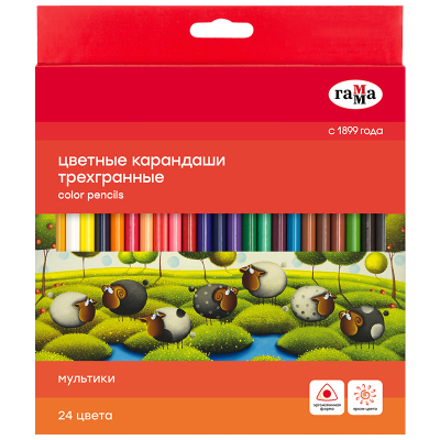 Цветные карандаши ГАММА серии «Мультики» выполнены в эргономичном трехгранном корпусе, который подскажет ребенку, как правильно держать инструмент во время творческих занятий. В наборе 24 цвета. Диаметр грифеля — 2,9 мм. Проклеенный ударопрочный грифель не крошится во время заточки и не ломается даже после падения. Корпус карандаша диаметром 7 мм и длиной 174 мм изготовлен из дерева. Специальная обработка древесины позволяет легко заточить карандаш без зазубрин и заноз. За яркость и высокую укрывистость отвечают качественные пигменты в составе. Ребенку не придется сильно давить на карандаш — рисунок получится ярким и равномерно закрашенным. Упаковка – картонная коробка с европодвесом. • Количество цветов: 24; • Форма корпуса: трёхгранная; • Заточка грифеля: да. • Количество карандашей: 24.