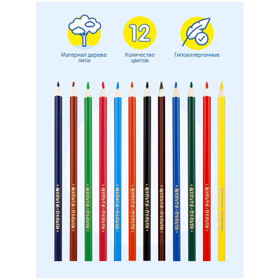 В наборе 12 цветов, диаметр грифеля составляет 3 мм, что увеличивает срок службы карандаша. Карандаши упакованы в картонную коробку с глянцевой ламинацией и европодвесом. Товар предназначен для детей старше 3-х лет.