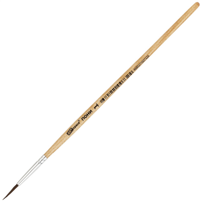 Художественные кисти ArtSpace изготовлены из волоса пони. Он несколько толще, чем у белки, расстояние между волосками больше, поэтому воду такая кисточка набирает меньше, чем из белки или колонка. Приобретают форму конуса, не слишком упруги. Кисть круглой формы с короткой ручкой из дерева идеальна для начинающих художников, поэтому её часто используют в детских образовательных учреждениях.