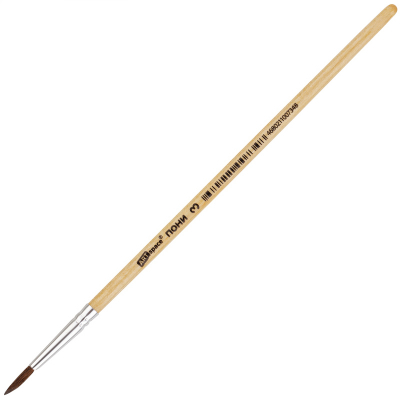 Художественные кисти ArtSpace изготовлены из волоса пони. Он несколько толще, чем у белки, расстояние между волосками больше, поэтому воду такая кисточка набирает меньше, чем из белки или колонка. Приобретают форму конуса, не слишком упруги. Кисть круглой формы с короткой ручкой из дерева идеальна для начинающих художников, поэтому её часто используют в детских образовательных учреждениях.