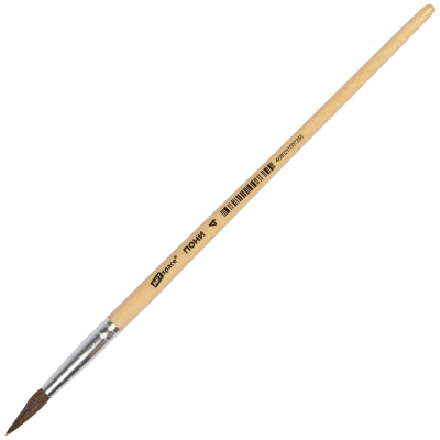 Художественные кисти ArtSpace изготовлены из волоса пони. Он несколько толще, чем у белки, расстояние между волосками больше, поэтому воду такая кисточка набирает меньше, чем из белки или колонка. Приобретают форму конуса, не слишком упруги. Кисть круглой формы с короткой ручкой из дерева идеальна для начинающих художников, поэтому её часто используют в детских образовательных учреждениях.