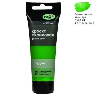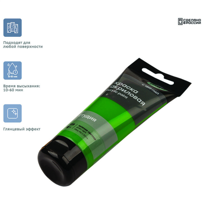 Новая акриловая краска серии «Студия» зелёного светлого цвета предназначена для художественно-живописных и декоративно-прикладных работ. Главные отличия: насыщенный цвет, густая консистенция, высокая адгезия, прочность красочного слоя. После высыхания краска становится глянцевой, практически не темнеет, специальная добавка позволяет максимально раскрыть красоту цвета. Художественный акрил прекрасно разносится, подходит для бумаги, картона, грунтованного холста, дерева, стекла, кожи, ткани. Время высыхания: от 10 минут до 1 часа в зависимости от толщины слоя. Прозрачный корпус тубы позволяет увидеть цвет краски, а удобная крышка флип-топ предотвращает высыхание. Объём тубы — 75 мл.
