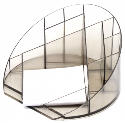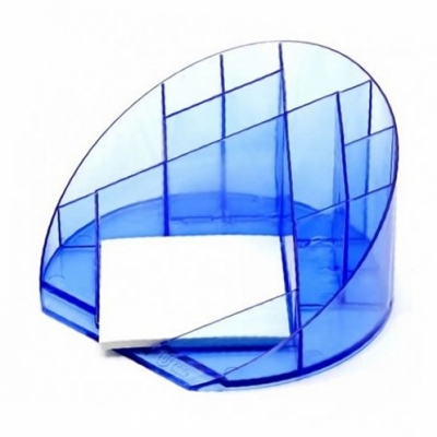 Подставка для письменных принадлежностей изящной формы. Изготовлена из качественного пластика. Включает в себя 12 отделений и бумажный блок для заметок. 100*175 мм