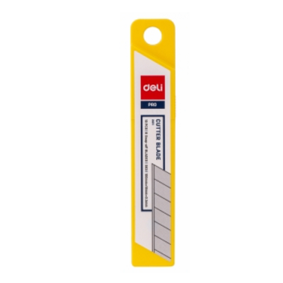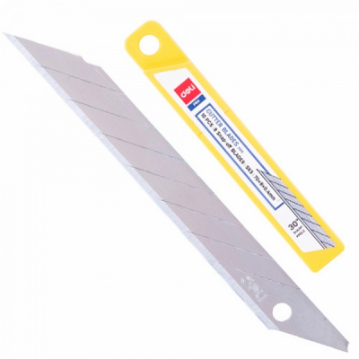 Лезвия Deli для ножа 9 мм (10 шт в пластиковом пенале) из углеродистой стали, 7 отламывающихся частей, острый угол 30°.