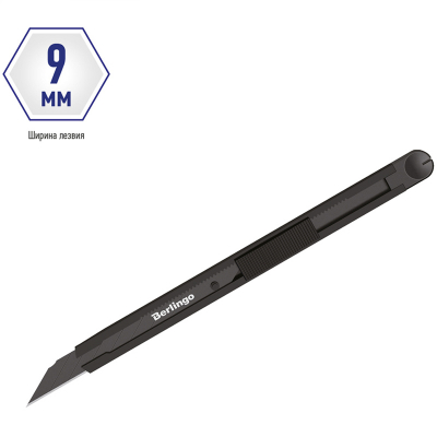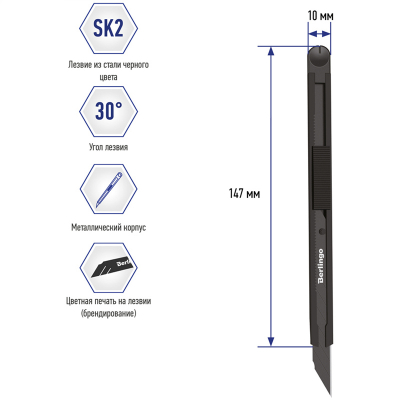 Серия "DoubleBlack". Нож канцелярский с автоматической системой фиксации лезвия auto-lock. Корпус ножа полностью металлический. Цвет корпуса - черный. Комплектуется износостойким лезвием черного цвета из стали SK2 с углом 30°. Ширина лезвия - 9 мм. Индивидуальная упаковка - пакет с европодвесом.