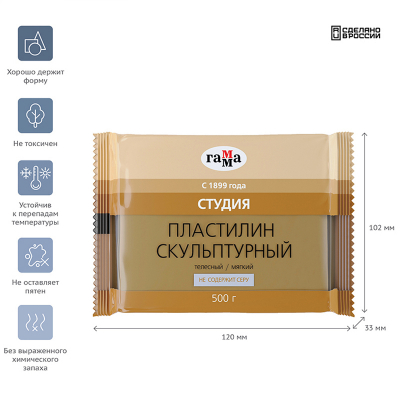 Скульптурный мягкий пластилин ГАММА серии «Студия» телесного цвета. Прекрасно держит форму и устойчив к перепадам температуры, не оставляет пятен и не липнет к рукам. Не токсичен: не содержит серу, без выраженного химического запаха. Скульптурный пластилин ГАММА помещён в вакуумную упаковку. Вес бруска — 500 г.