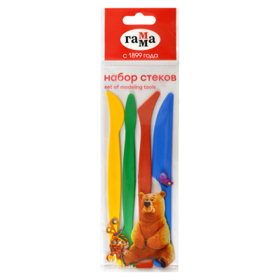 Набор стеков ГАММА предназначен для моделирования при работе с материалами для лепки. В наборе 4 цветных стека из полистирола: жёлтый, зелёный, синий, красный. Каждый стек имеет 2 рабочих конца разной формы и предназначения. Стеки подходят для более точной проработки мелких деталей, которые сложно сделать пальцами, а также для придания фактуры изделию. Рекомендуются для использования при работе с пластилином, полимерной и любой другой глиной, а также с гипсом и прочими пластичными массами. Набор упакован в яркий пакет с европодвесом.