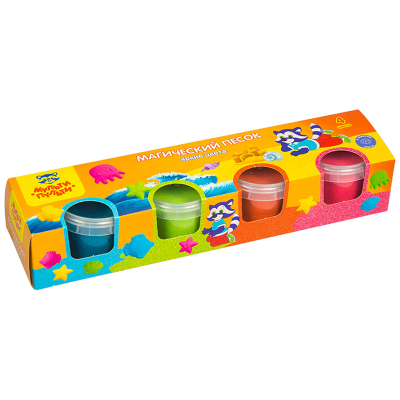 Набор из четырех ярких цветов песка для лепки «Мульти-Пульти» серия «Приключения Енота» содержит четыре баночки песка для лепки (оранжевый, зеленый, синий, розовый) и формочку. Вес одной баночки – 140 г. Магический песок обладает кинетическим эффектом и достаточно пластичен, не сохнет, хорошо держит форму и лепится с помощью формочек или просто руками. С его помощью легко проявить фантазию и сделать яркие поделки. Удобная картонная коробка позволит все аккуратно хранить в одном месте. Подходит для детей старше трёх лет.