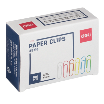Скрепки канцелярские Deli, цветные, длиной 33 мм, 100 шт в коробке, обеспечивают надежное скрепление бумаги.