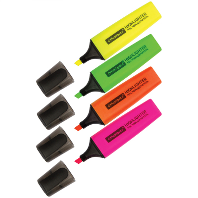 Набор текстовыделителей с флуоресцентными чернилами на водной основе. Удобный клип. Цвет торцевого элемента соответствует цвету чернил. 4 штуки текстовыделителей упакованы в прозрачный ПВХ чехол. Цвета: желтый, оранжевый, розовый, зеленый.