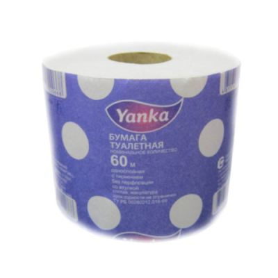Однослойная туалетная бумага 60метров Yanka (Янка) в бумажной обертке светло-серого цвета со втулкой и тиснением, из вторичного волокна (макулатуры) для санитарно-гигиенического назначения. Цвет - серый. Производство — ОАО "Спартак", РБ.