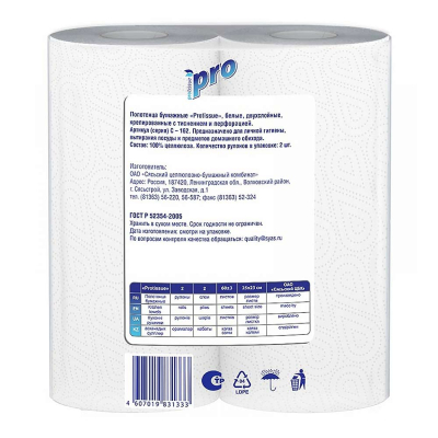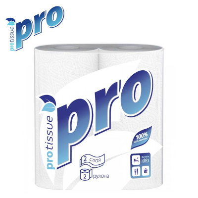 Двухслойные бумажные рулонные полотенца с тиснением PROtissue Premium из новой серии изделий. Прекрасно впитывают, подходят для универсального применения. Состав — 100 % целлюлоза без добавления хлора, 60 листов в рулоне, общая длина 15 метров, размер листа — 25 х 23 см.