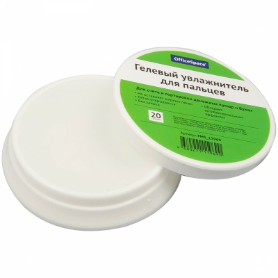 Гелевый увлажнитель для пальцев. Предназначен для работы с бумагами и пересчета денежных купюр. Обладает антибактериальным эффектом, не оставляет жирных пятен, не содержит ароматизаторов. Расфасован в пластиковые контейнеры по 20 грамм. Не скользит по поверхности стола. Упакован в индивидуальную картонную коробку.