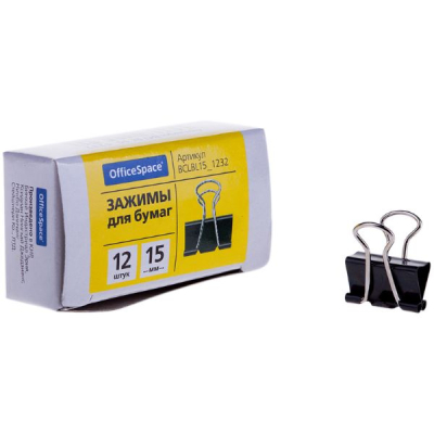Металлический зажим для бумаг, корпус окрашен в черный цвет. Для скрепления большого количества листов. Не деформируют бумагу. Цвет - черный. 12 штук в коробочке.