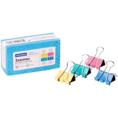 Зажимы для бумаг 25мм, OfficeSpace, 12шт., цветные, картонная коробка BCLC25_19358